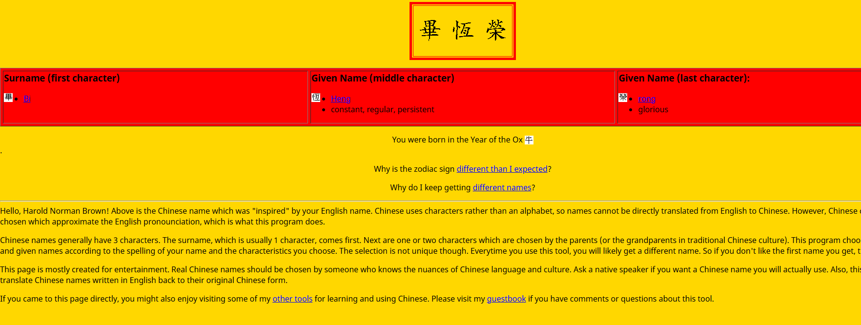 However, it just requires a lot of knowledge, and so I’d recommend going with this website Get a Chinese Name. I just wrote “Brown” as your last name because of the B, and the only Chinese last name I can think off of the top of my head is Bi anyway. I think the last name isn’t as important. But this site will ask your name, birthday, and what category of names you want. You can run it over and over again and put together a list of names that you like. This website basically picked characters that are roughly close to your name’s pronunciation, so it miiiight not sound 100% authentic, but it’s still not bad.