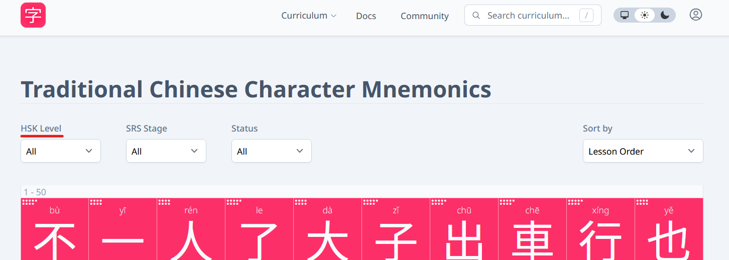 Also for the levels, if you go to Cirriculum > Characters, you can sort by HSK level to see all the characters in that level, for example: HSK 1 only characters here: Traditional Chinese Character Mnemonics | HanziHero.