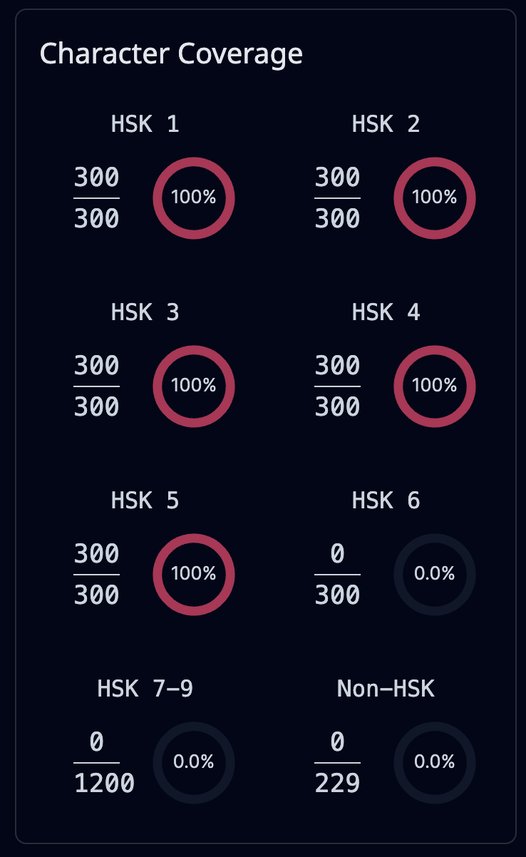 I finished HSK 4 & 5 in HH in 3 months, and I found another app that complements my reading progress: Du Chinese. I increased my goal to 2000 characters (from HSK 6, which is 1800 characters) in 1 year on HH, planned to stop learning new characters, and transition to Du Chinese after reaching my goal.